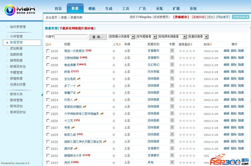 3.参看马克斯系统教程添加、编辑、更新数据,把数据链接指向www.77tingshu.com(附添加小说教程和软件)