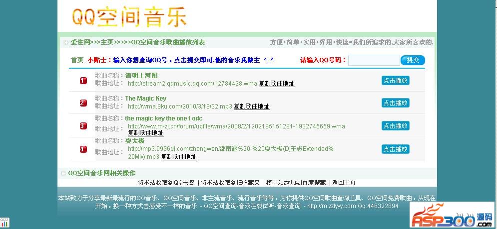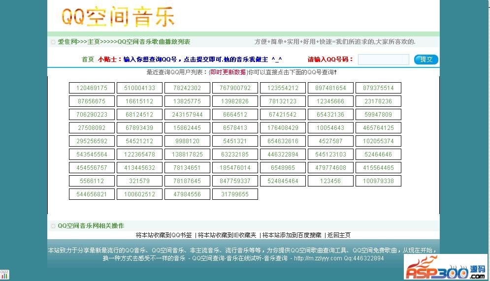 qq空间音乐查询小偷是一款可以抓取QQ空间用户的音乐程序,唯一的缺陷就是不能弄10位数以上的QQ,程序大家研究下。