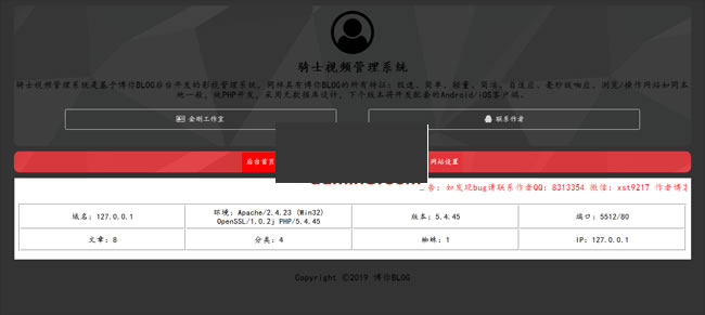 骑士视频管理系统是基于博你BLOG后台开发的影视管理系统,同样具有博你BLOG的所有特征:极速、简单、轻量、简洁、自适应、毫秒级响应、浏览/操作网站如同本地一般,纯PHP开发,采用无数据库设计,下个版本将开发配套的Android/iOS客户端。