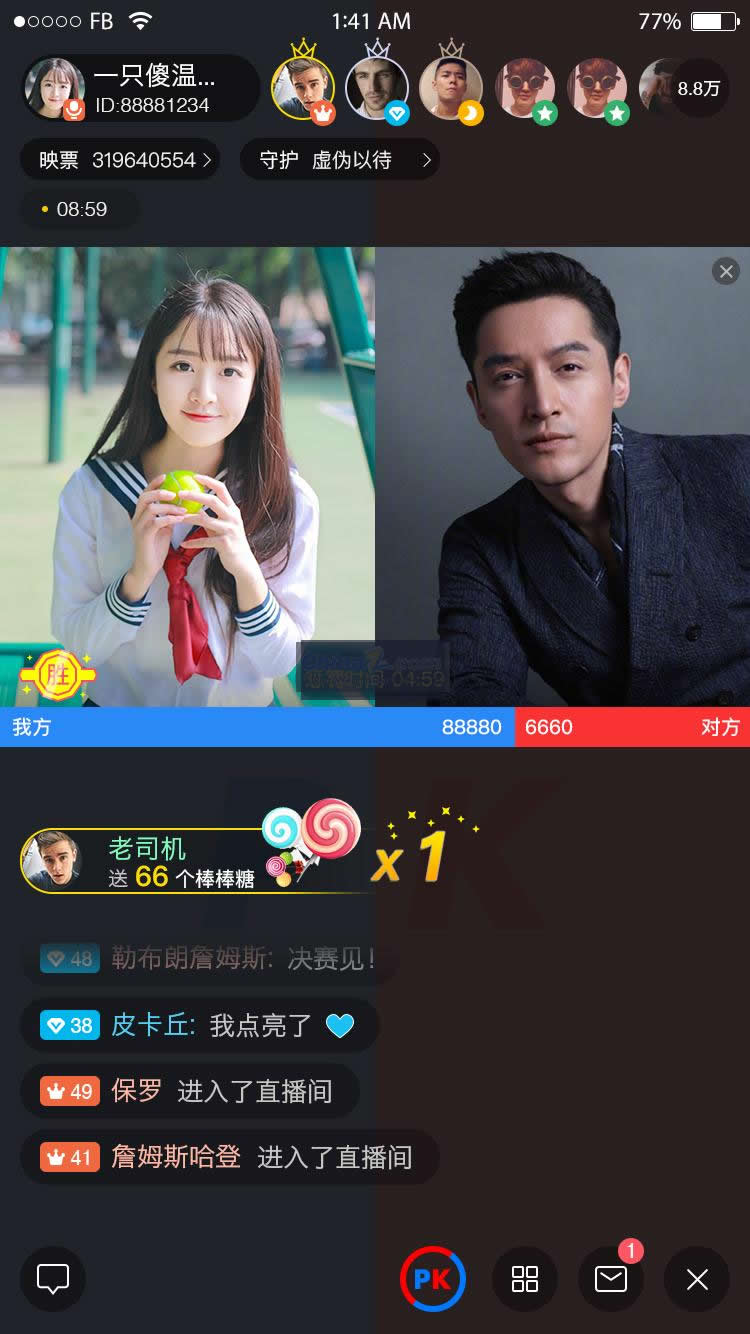 4.优化礼物功能,热门礼物可影响到在热门列表的排序,连送礼物可按组赠送,赠送豪华礼物时直播间会有飘屏通知