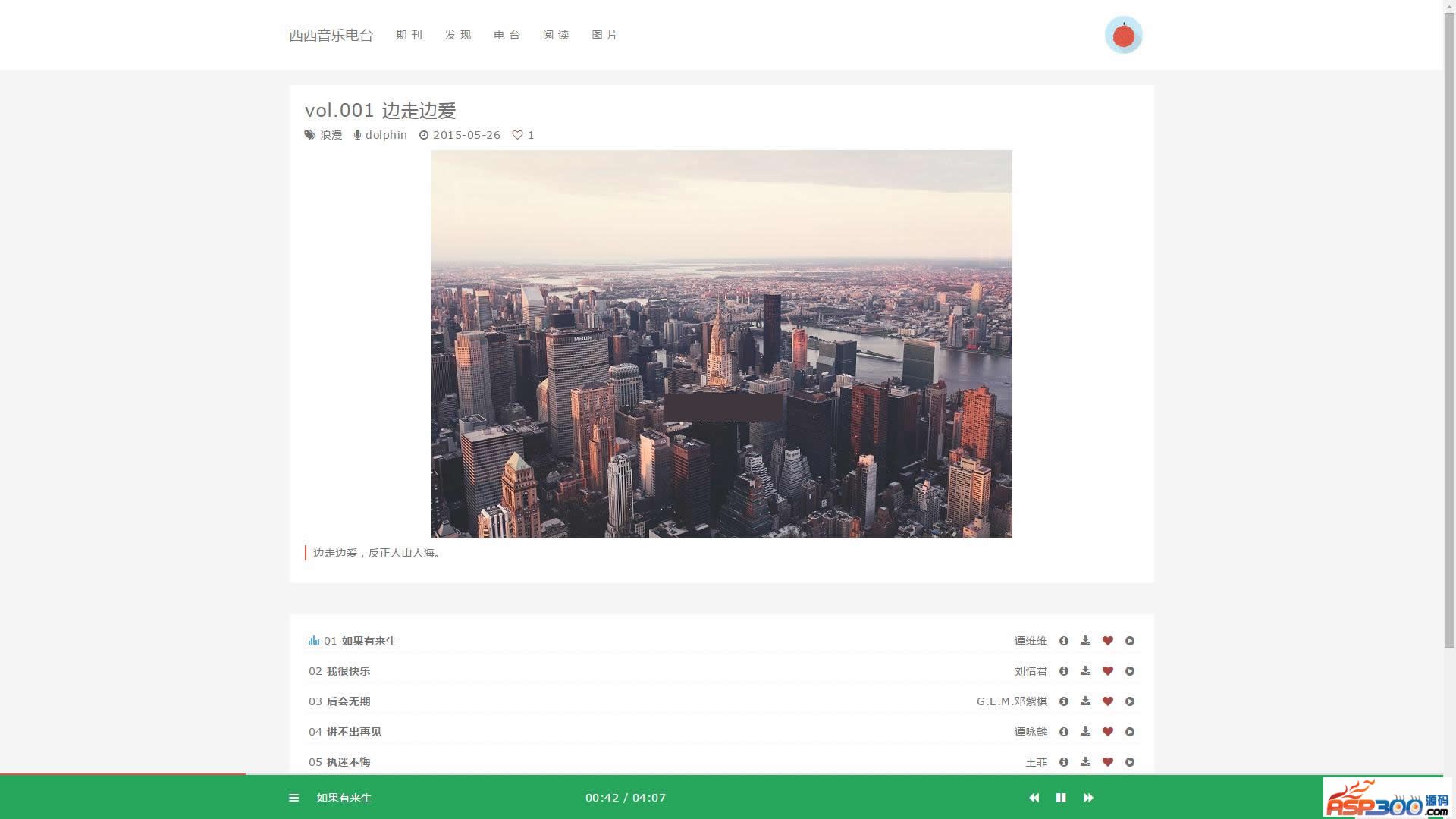 西西音乐电台是一套基于CodeIgniter与Bootstrap的音乐电台程序,集音乐期刊、音乐电台、阅读、图片功能于一身。响应式设计,能很好的兼容各终端设备和分辨率。无需伪静态支持,安装简单。支持网易云音乐、百度音乐、七牛云存储、本地上传。