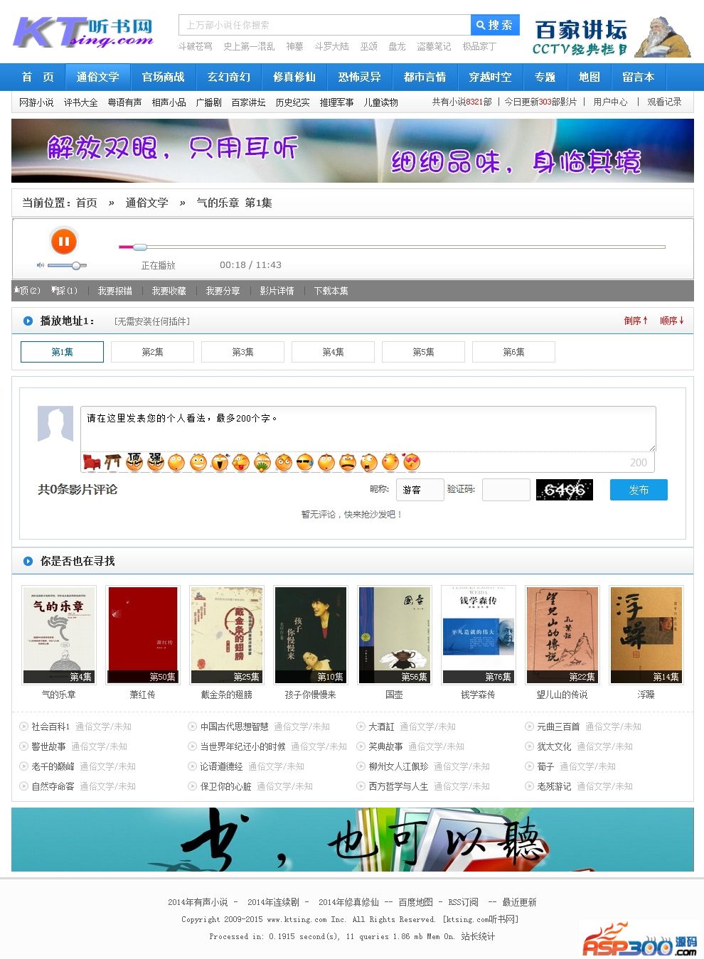 KT听书网KT有声小说网源码,集成了优秀的小说CMP播放器和KT小说联盟的采集插件,资源丰富。