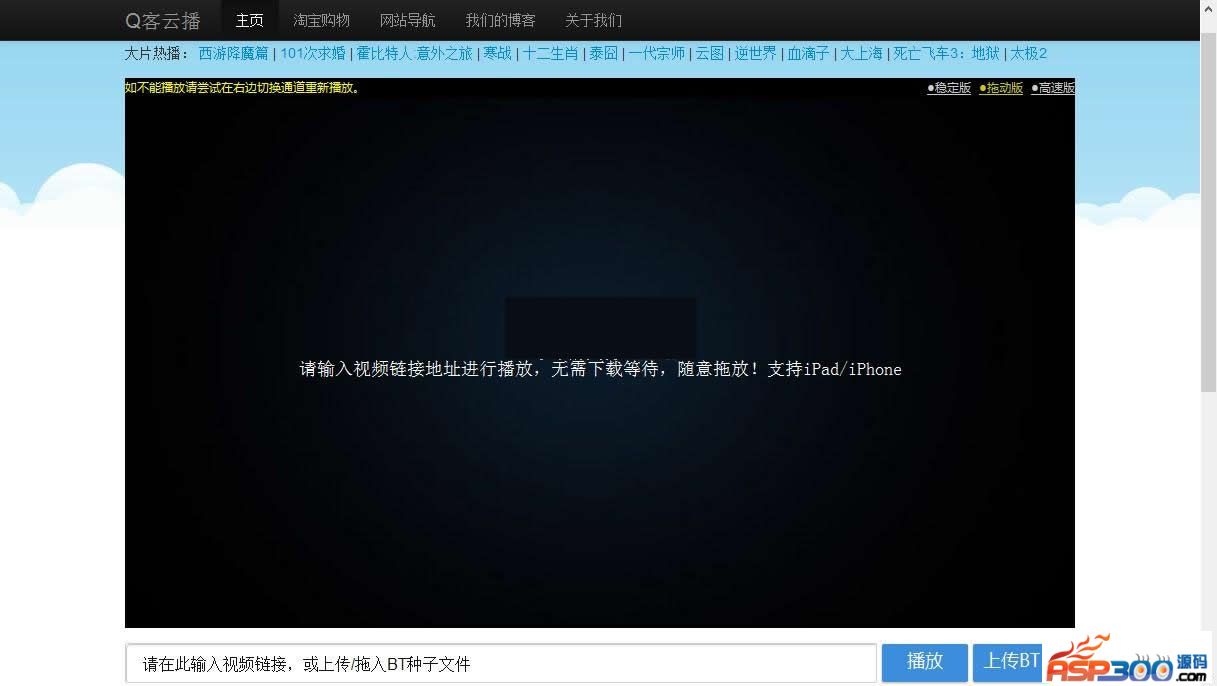 本源码可直接支持的格式如下:1.普通的链接格式,例如:http、ftp开头的网址;2.电驴格式,例如:ed2k开头的网址;3.迅雷格式,例如:thunder开头的网址4.bt种子上传播放支持拖动播放,3个核心随你转换最重要的是没有其他的弹窗,干净无反感!安装:直接放置到网站根目录下,即可正常访问运行。不需要数据库演示:http://vod.1qwer.com