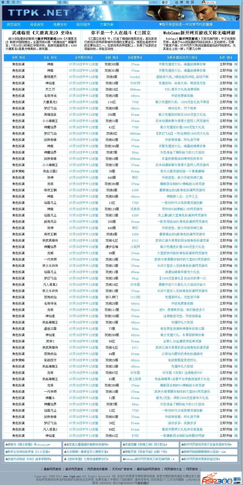 TTPK.net网页游戏个人游戏发布程序经营性游戏媒体网站以其独特的方式,在所有的网站中,以获利快,运行方便等特点,让许多站长爱不释手!运行时的简单程度也可想而知,收钱,发广告,做内链外链,宣传,再循环。本系统独特之处:1、自助型发布系统,大大减少站长操作难度,管理员只需要出售积分就可以了。2、批量型采集系统,大大减少站长对站内维护工作,管理员只需要做外链,拉百度排名就可以了。3、全功能型后台,数据库备份,快速的搬家功能,留好一个备份文件,再也不怕官网的毁灭性打击了(主要针对传奇私服)。4、双功能型前台,站长们可以用来当做传奇发布站,也可以当做页游发布站。后台一个点击,整个网站发生变化。5、适应管理员发外部链接内容,后台操作方便。6、注册用户管理方式,独特的操作方式,让您管理更方便,维护更容易。7、时间线广告管理,省去了站长进行下架操作。自己可以选择几套CSS和LOGO,努力完善良当中!如果您有更好的建议,请您联系站长邮箱wj8624@126.com您也可以加入群29094625您也可以到我们主页上来坐客。