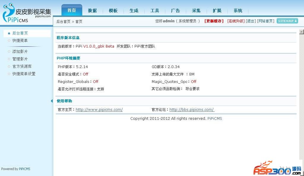 PiPiCMS皮皮影视采集程序,是一款基于PHP+MySQL的影视建站程序。