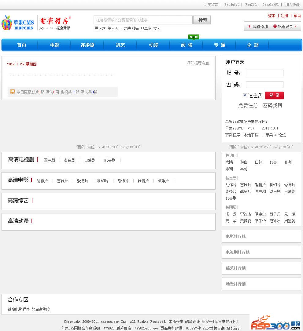 苹果MacCMS视频电影程序是一套采用ASP+MSSQL/ACCESS (PHP+MYSQL)环境下运行的完善而强大的视频电影系统。经过近多年的开发经验和技术积累,苹果MacCMS视频电影程序已逐步走向成熟,在易用性和功能上已经成为同行中的佼佼者。程序体积小->优化程序代码,运行速度快->高效的缓存处理,只要普通的虚拟主机就可以完美搭建起来,建站成本非常低。仿MVC模板分离,内置标签,asp自定义函数标签接口,强大的自定义采集功能,只要你会HTML就可以轻松做出个性化的网站。程序易用性和功能上一直以来都积极采纳广大站长提出的各种好的建议,迅速响应各种紧急问题,我们的服务理念贯穿其中,保证每一位站长每一个环节都可以从容应对。