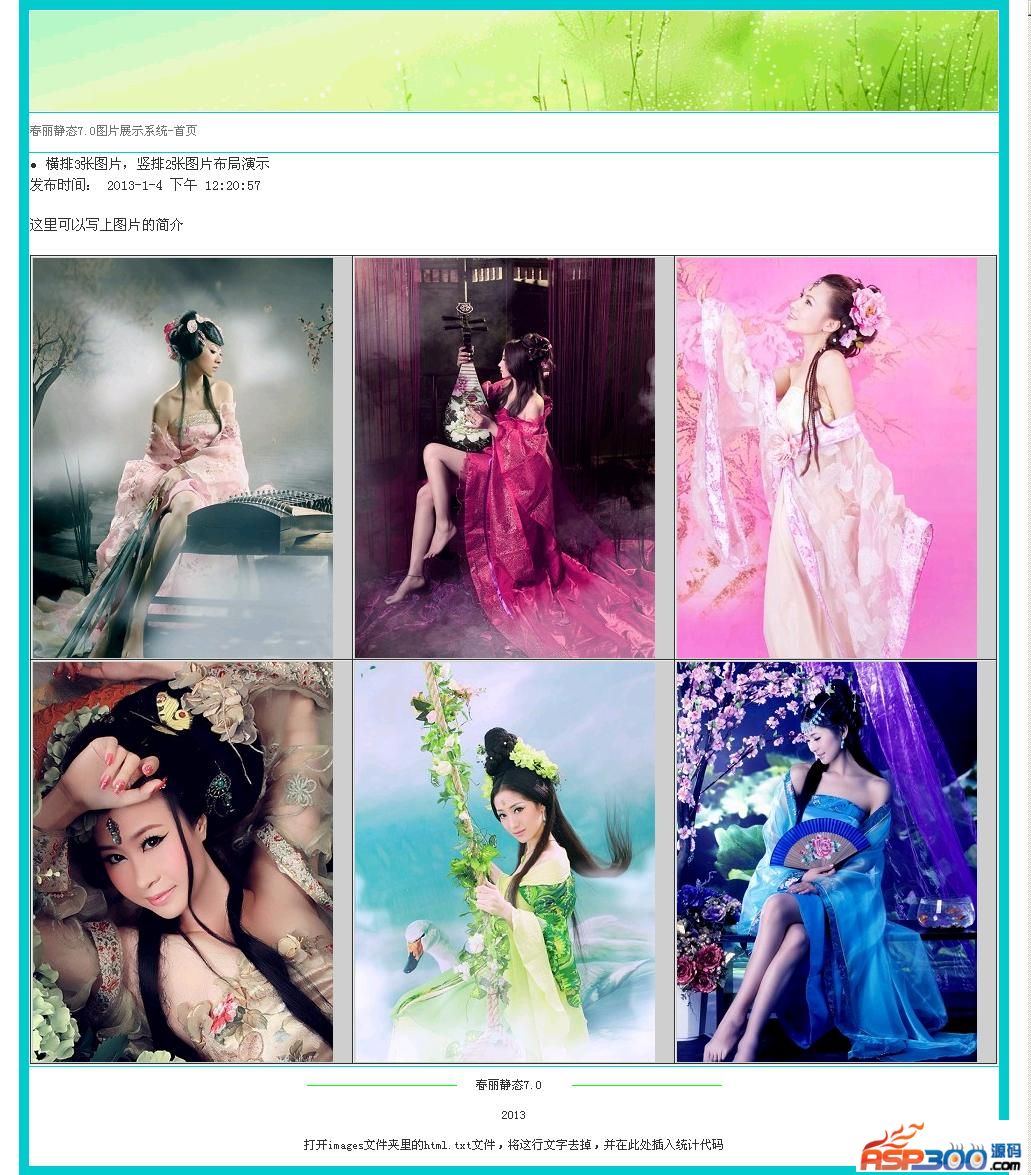 “春丽静态7.0图片展示程序”特点是小巧,以简洁为主题,可以单独使用,也可以同已有的网站程序一起融合运行,此程序系统操作时为“半自动式”,可以根据网页排版布局的需要,灵活变换其模式,适合喜爱手动排版的建站爱好者使用。