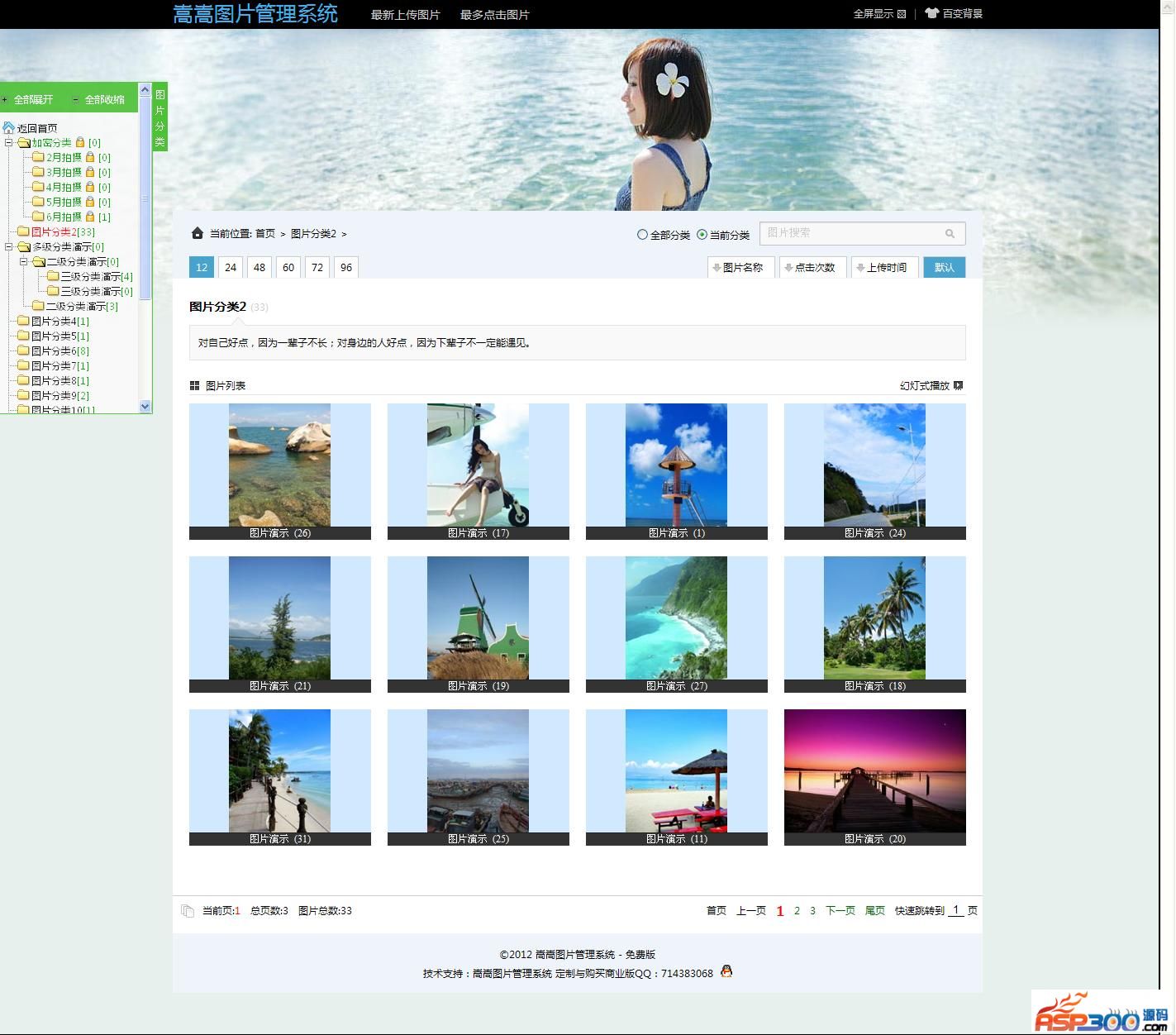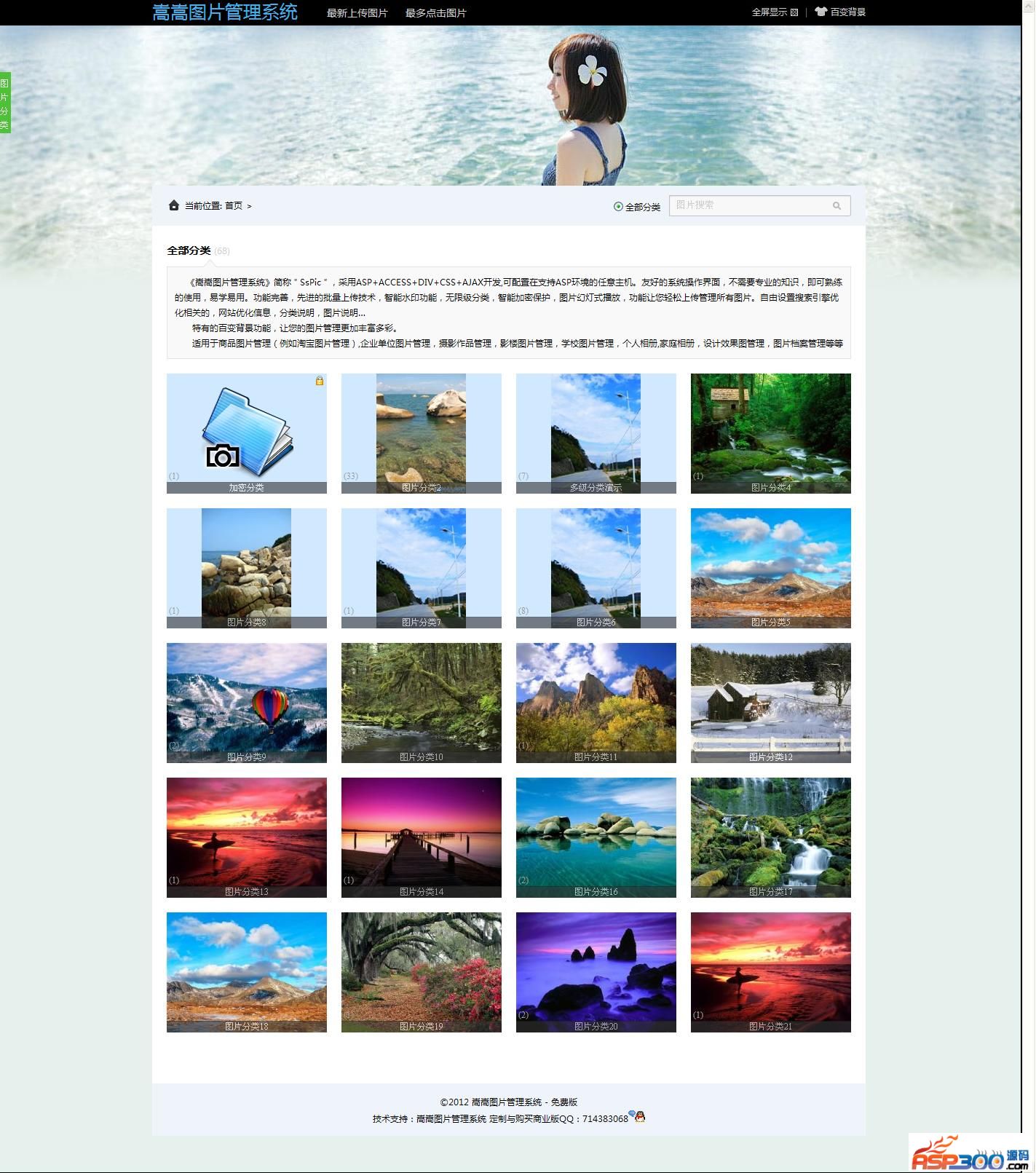 《嵩嵩图片管理系统》简称"SsPic",采用ASP+ACCESS+DIV+CSS+AJAX开发,可配置在支持ASP环境的任意主机。友好的系统操作界面,不需要专业的知识,即可熟练的使用,易学易用。功能完善,先进的批量上传技术,智能水印功能,无限级分类,智能加密保护,图片幻灯式播放,功能让您轻松上传管理所有图片。自由设置搜索引擎优化相关的,网站优化信息,分类说明,图片说明…特有的百变背景功能,让您的图片管理更加丰富多彩。后台目录 /admin/帐号:admin密码:admin适用于淘宝相册,企业相册,单位相册,公司相册,摄影相册,影楼相册,学校相册,个人相册,家庭相册,班级相册商品相册淘宝图片管理,企业图片管理,单位图片管理,公司图片管理商品图片管理,产品图片管理影楼相片管理,学校图片管理,班级图片管理摄影作品管理,设计图片管理