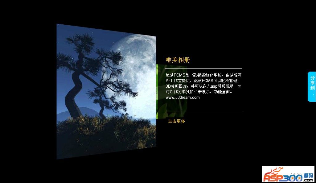版本说明:追梦FCMS 3D相册系统采用flash为主界面,asp系统,可以运行在任何支持IIS平台,不仅可以作为单独的相册系统使用,也可以嵌入asp页面中,更可以嵌入到支持asp的空间中html页面中。3D相册系统需要主机开启FSO功能。