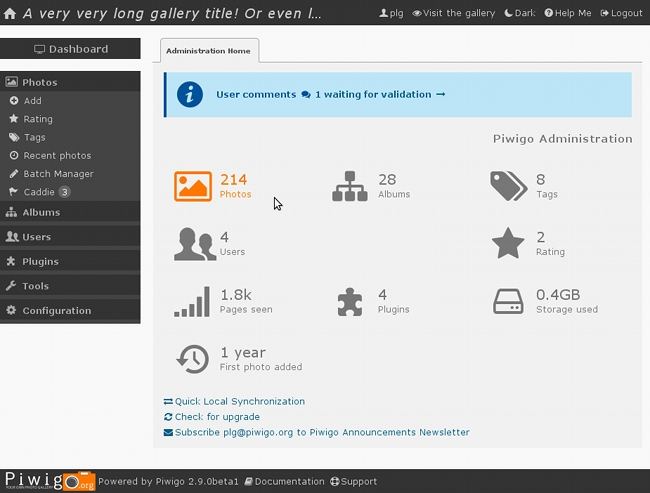 管理员可以创建用户,组,管理权限并发送通知。几个管理员可以在Piwigo中同时工作。非常适合您的团队!