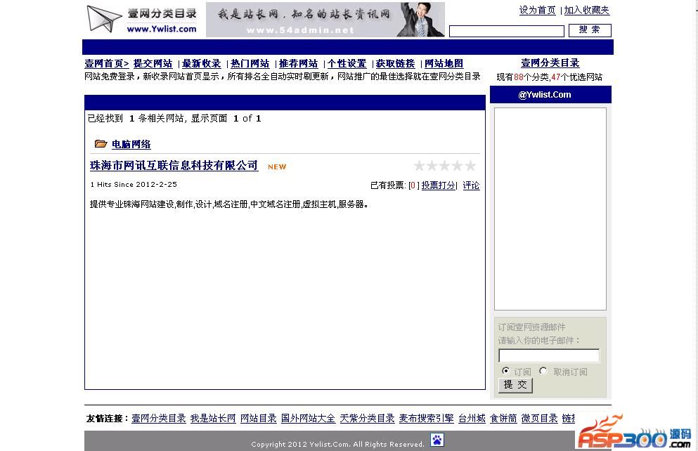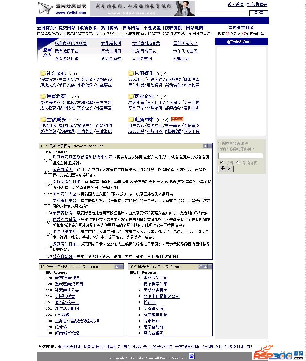 壹网分类目录是基于ASP开发的一套系统,具备来路、去路统计功能,支持两级分类,本系统特点速度快、占用服务器资源小、扩展功能强大,能方便快捷地建立您的网站目录。收录各类优秀网站的中文网站目录,用户自主提交网站,网站分类目录网站导航检索,为搜索引擎提供优秀的索引参考,为各行业分类目录收藏整理,打造网站目录提交优化推广及互联网资讯分类网站名录。