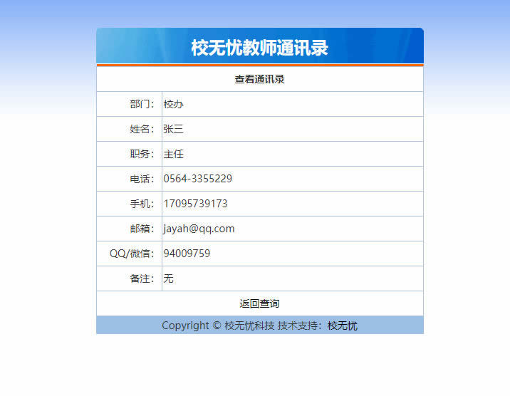 校无忧教师通讯录系统是为了方便单位内部随时随地查询通讯信息而制作,用户可在手机端实时查看人员联系方式,拨打电话等,全面提高了内部沟通效率,系统适用于学校、教育机构、企事业单位在互联网上进行通讯录管理查询。