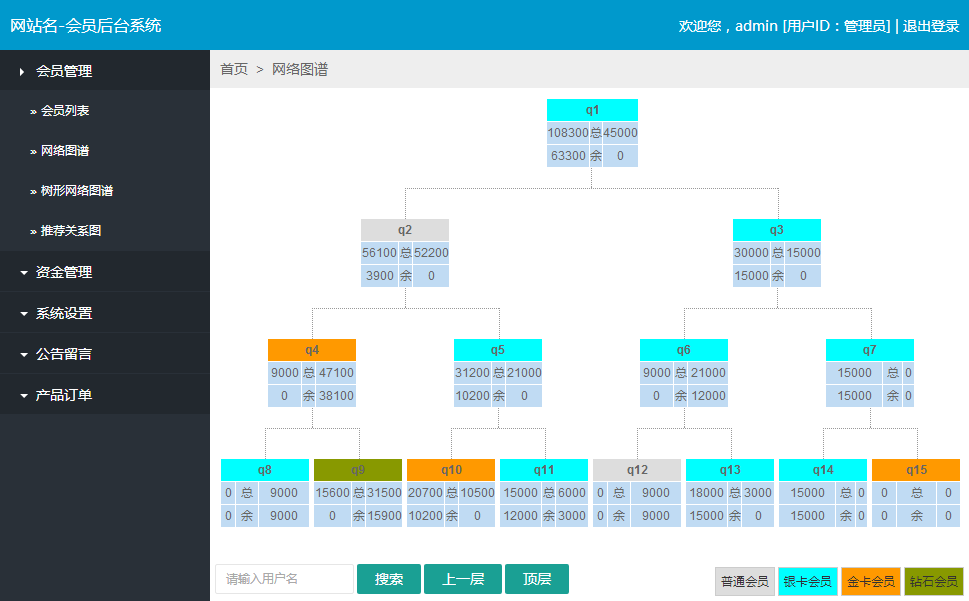 主要功能有 会员管理 网络图谱 树形图谱 推荐关系图 提现管理 转账管理 产品管理 订单管理 会员注册 公告邮件 银行卡管理等