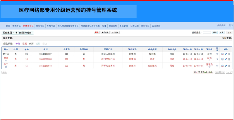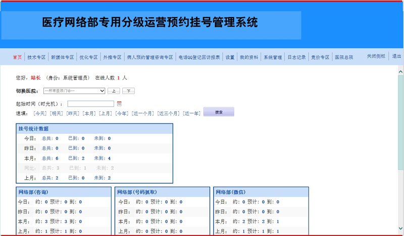 新媒体专区–>预约登记(全组)我的预约登记月到诊报表新媒体月到诊报表周到诊报表新媒体到诊率咨询报表