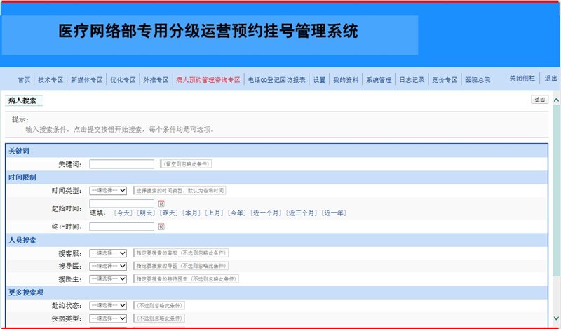 病人预约管理咨询专区–>预约登记列表预约病人搜索重复病人查询客服明细报表月趋势报表自定义图形报表