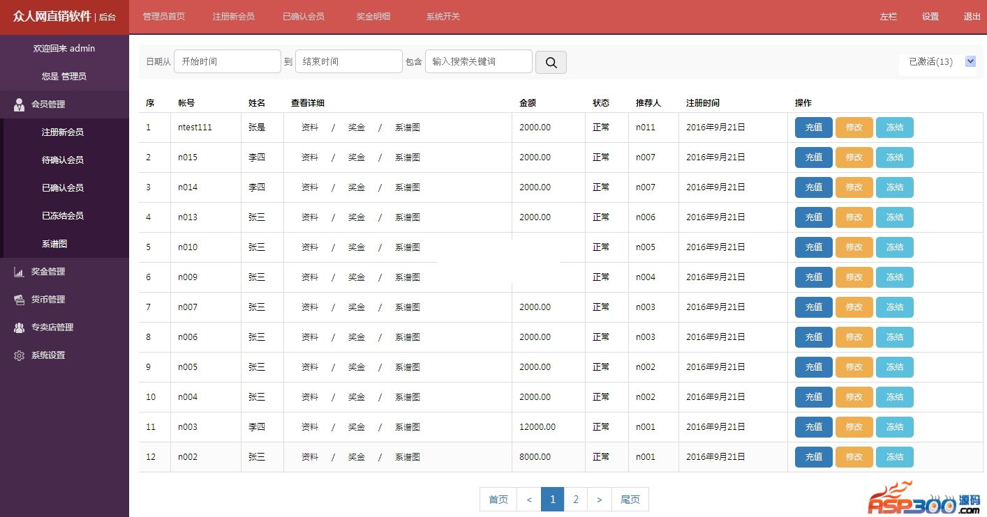 6、修改会员奖金明细里,如果是新增金额,显示为绿色,如果是减少金额,显示为红色,加上负数标记显示。
