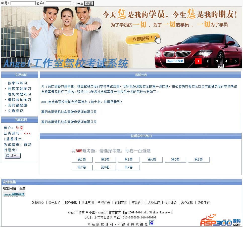 系统功能特点:Angel工作室驾校管理系统asp语言开发,可以模拟驾校考试,让更多的学员熟悉考试步骤。该考试系统基于BS架构开发,可以放到外网测试。方便本地单机的麻烦内置IIS测试,双击打启动预览该系统,友情提示:因自带的IIS服务不太好使用,最好是本地IIS信息管理器进行使用。 后台功能介绍:1、系统基本信息:系统配置、管理员、木马查杀等。2、公告/幻灯管理:可以在后台设置考试系统幻灯/和公告信息。3、考试管理:科目一考试、科目二、科目三等试题添加、修改、删除等功能以及交通标志。4、用户管理:对会员进行新增、删除、修改,以及对等级进行管理。5、辅佐功能:介绍单页面管理、友情链接管理、QQ客服管理等功能。6、数据库管理:空间占用查看、数据库备份、数据库压缩、上传文件管理。