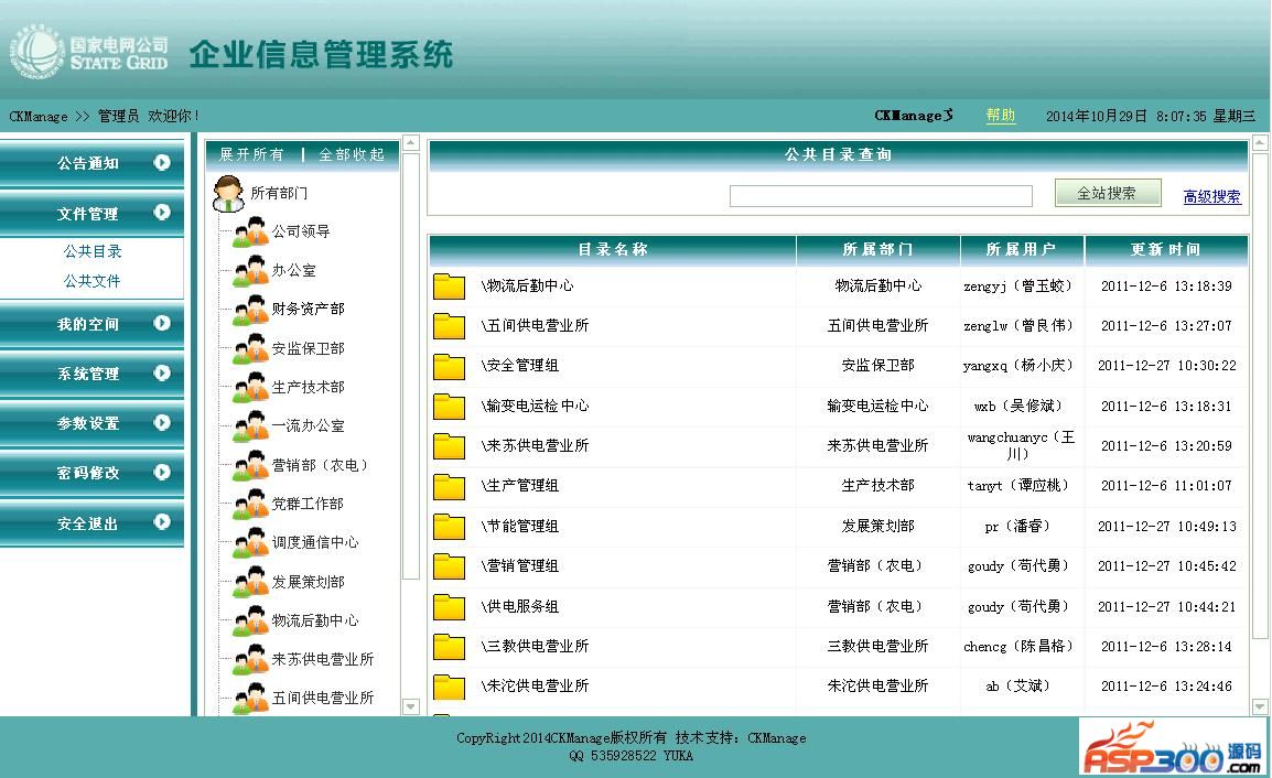 用户可以通过CKManage文件信息管理系统上传下载文件(非FTP方式)。可以完成在线创建文件夹、复制粘贴文件、解压压缩文件、搜索文件、文件夹加密、文件加密、文件夹共享、回收站等功能,直观的来说,就是把windows操作系统中对文件的操作搬到了IE为基础的网站上。可以对用户上传文件进行规定,如上传大小,占用空间等后台地址admin/default.asp用户名和密码均为admin