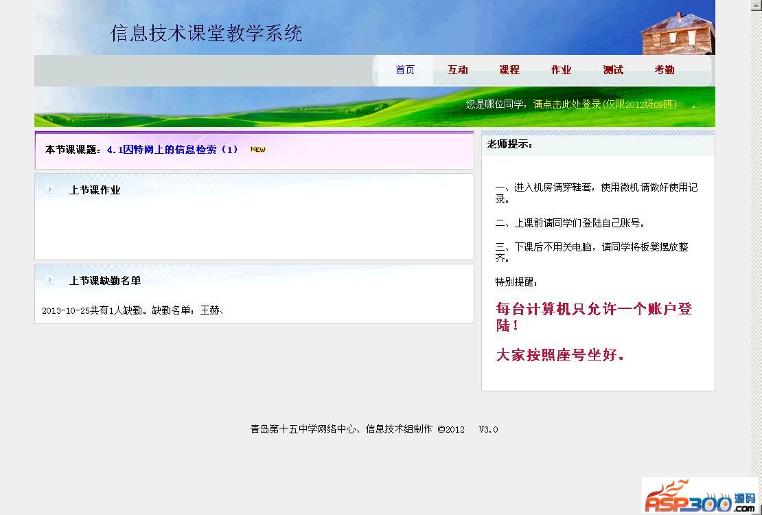 微机室是学校最早具备的网络环境,信息技术授课中考勤,教学资料共享,作业上交批改等完全可以依靠网络进行。所以我很早就在思考怎样利用网络进行教学和管理。最初使用BBS和Blog来尝试,效果总感觉不如意,2010年我的教育硕士论文《PJblog在信息技术网络课堂教学中的应用》写完后催生了自己编写一个专门的系统想法,2011年2月完成第一版并在学期教学中开始应用。