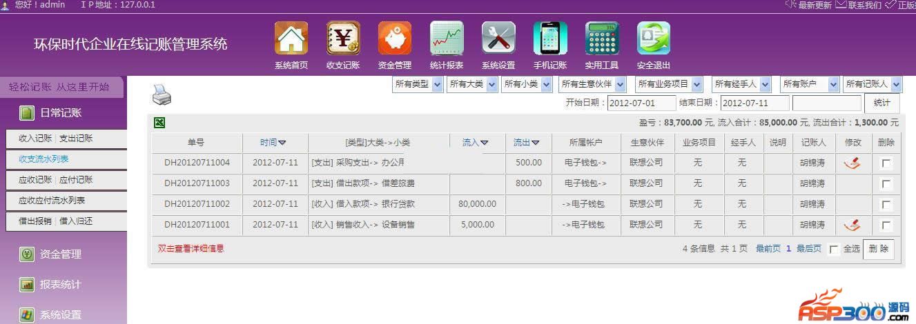 2、环保时代企业在线记账管理系统也可以说是一款傻瓜型的流水账管理系统,通过记录每日现金支出,收入的明细账,
