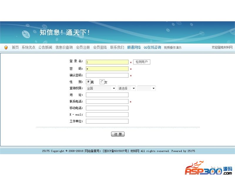 1.用户名注册:登 录 名:密码:确认密码:性别:查询权限:地址:联系电话: 移动电话:E – mail:工作单位
