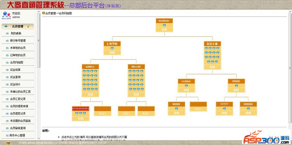 管理后台模块:会员审核,会员管理,订单管理,奖金结算,奖金发放,财务管理,产品管理,公告管理,及网站直销商城管理。