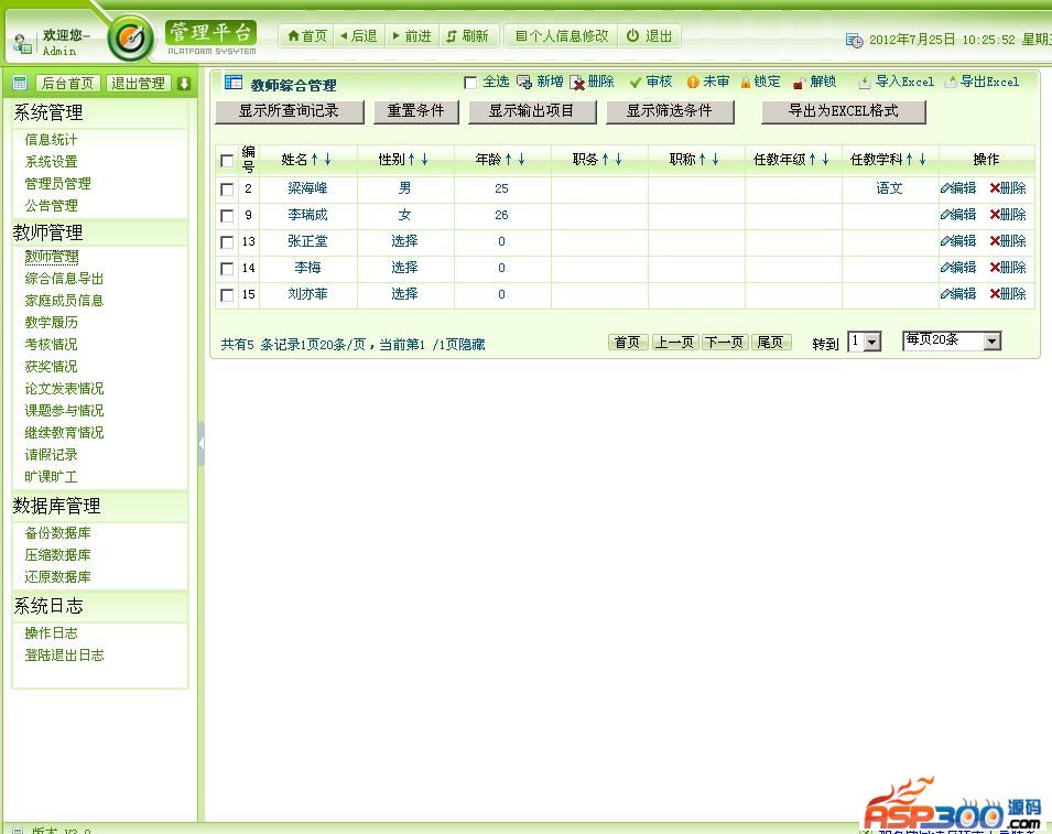 2、包含九大教师业务管理功能:家庭成员信息、考核信息、获奖信息、论文信息、履历信息、课题信息、继续教育信息、请假、旷工,所有项目可以导出到excel文件;