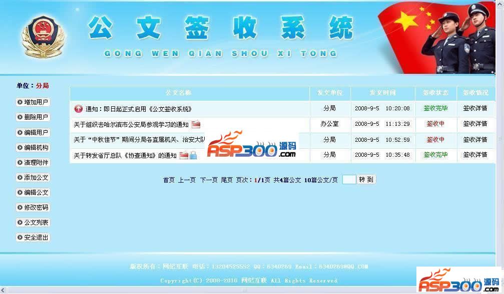 公文签收系统采用ASP+ACCESS开发的一套具有方便、快速、安全、高效的公文签收系统。本系统功能完备、使用方便快捷,已在全国各地的政府、司法、教育等部门成功应用,并得到了多方一致好评。本系统从公文的发布、查阅、签收、反馈、修改、删除等操作都将采用独立方式认证,确保系统安全稳定运行。