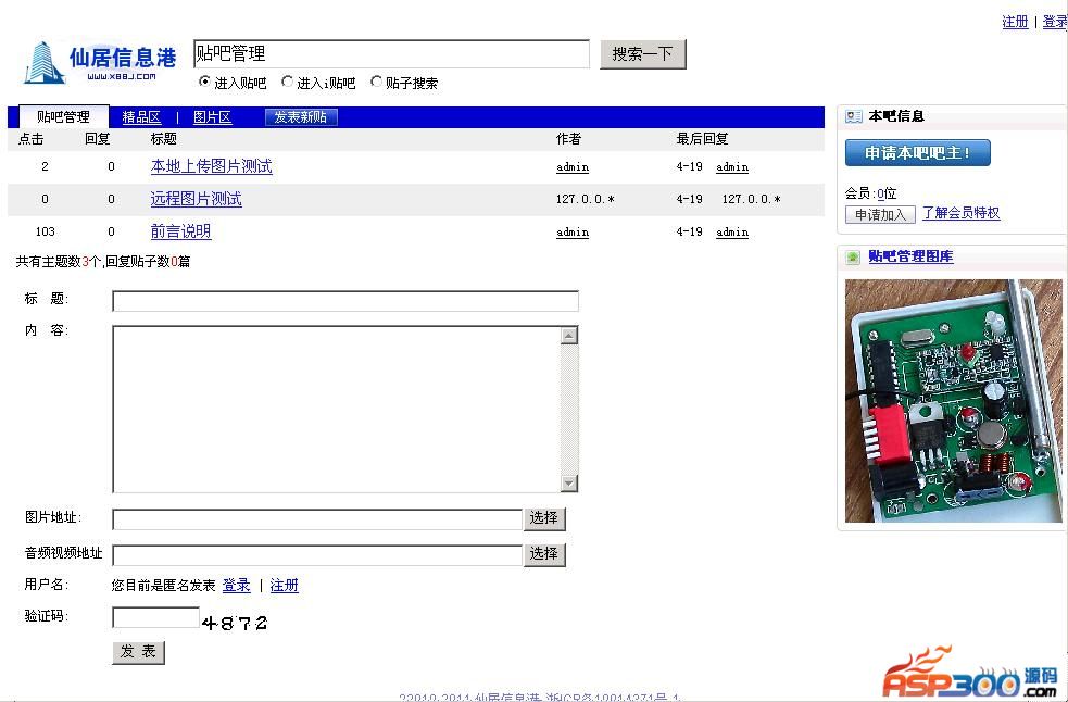 本程序样式来自海狸贴吧,但程序和他完全不同,由于本人不是专业搞编程,这个程序还不完善,很多地方需要修改,在空间上运行还是可以的,后台还没有制作好,使用者可以按自己思路去开发,其实数据库里面是完善的,虽然是贴吧,无级分类,各种权限也没有开发出来,希望谁能完善和我共享哦,代码仅作学习用,对于代码安全方面,请不要在本站测试,纯属代码爱好交流,完全开源,呵呵!我是新手,望高人修正,弄出完整的贴吧来