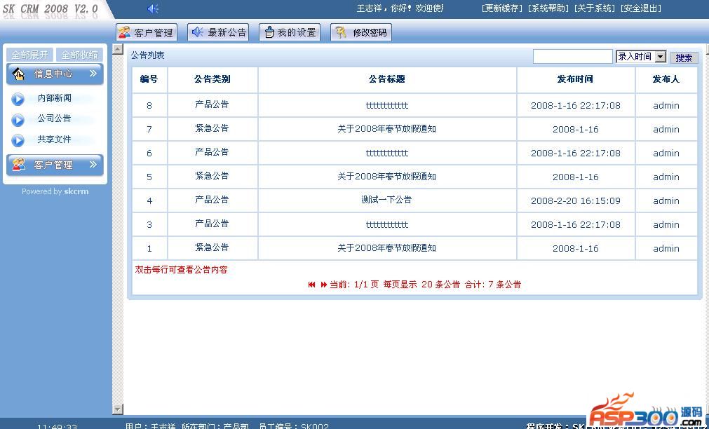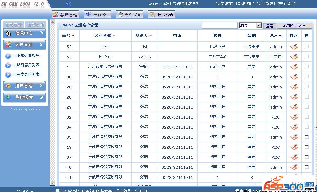 3.客户管理: 建立企业客户、维护客户–>售前管理–>售中管理–>售后管理–>统计报表(因为我用的是管理员账号,所以可以看到全部的内容)