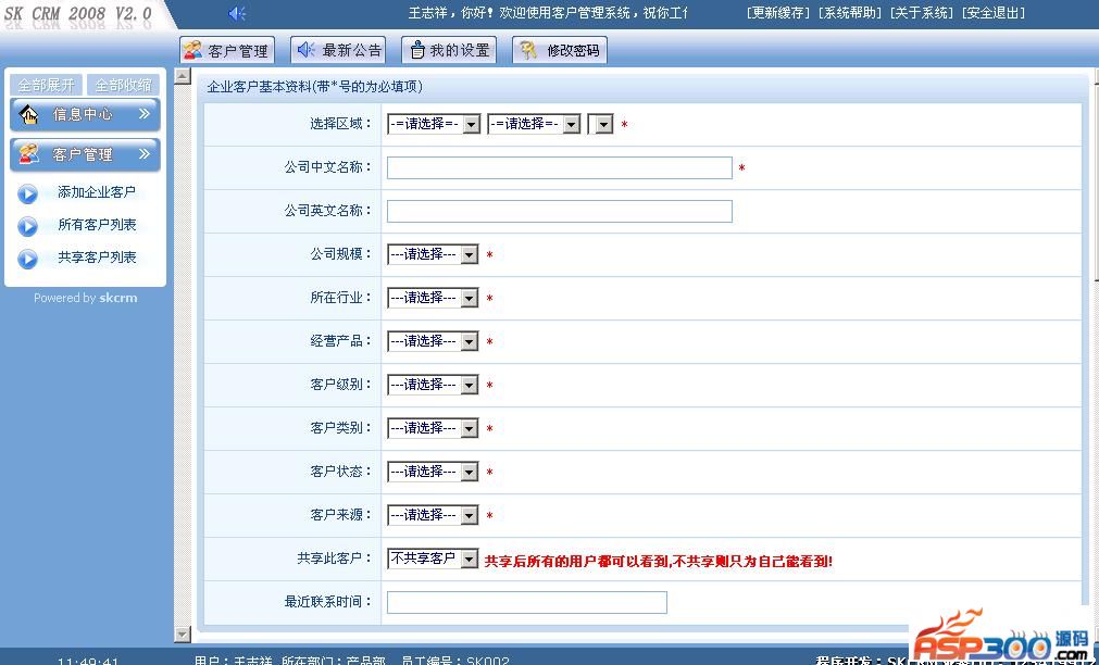 普通职员:对自己的客户进行添加,修改,删除,或者对其他业务员共享的客户进行读写。