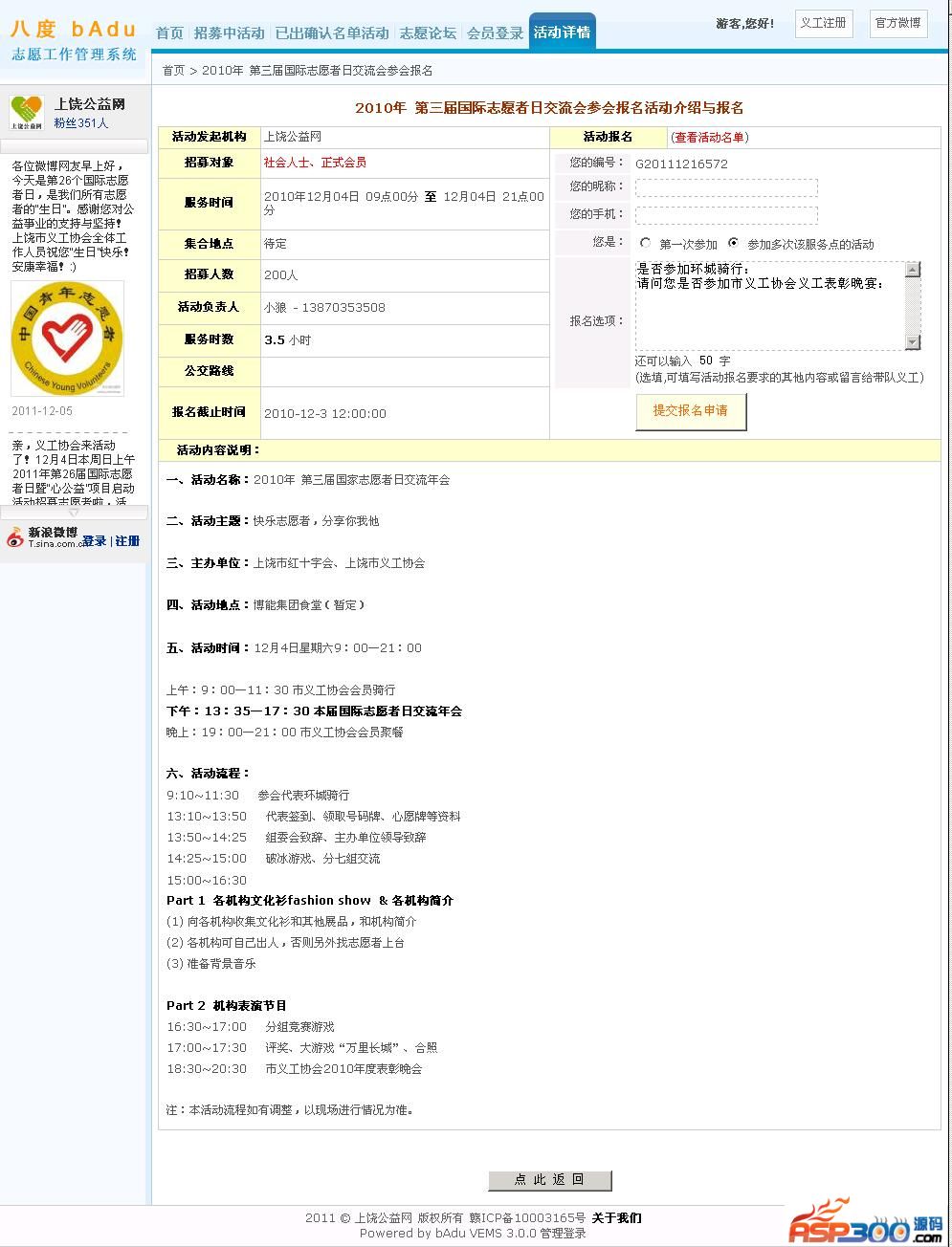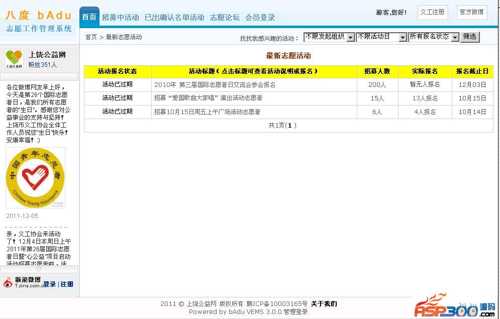 bAduVEMS 八度志愿活动管理系统是采用ASP+Access开发的通用型志愿者活动管理系统。该系统具备活动发布管理,活动确认名单在线审核,及报名资料Excel方式下载。系统还可以根据星期几进行查询活动,方便志愿者根据自己的时间选择参加某日的活动。 在经过几个版本试验后,推出3.0.1版本,自本版本起开始免费啦!