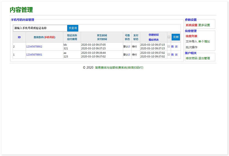 php简易扫码付教育收费系统是一个以Php+MySql进行开发的查询与收费软件。适用预设金额的学校学费收费,物业小区水电费收费等场景。用户查询自己的金额信息后扫码支付。管理员在后台导入用户及金额信息,可查看用户支付列表(可搜、可删改、有分页)。并有简单统计功能(已付未付单数及金额),支持导出。