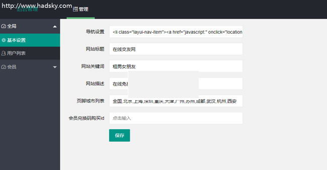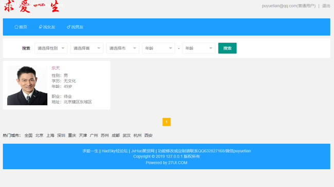 求爱一生-在线交友相亲系统基于TP5.0和layui开发,具有全国分类功能,上传图片及基本信息设置功能,会员功能及会员兑换码生成功能,数据库默认为SQLite(可以使用MySQL数据库),无需任何操作上传即可用。