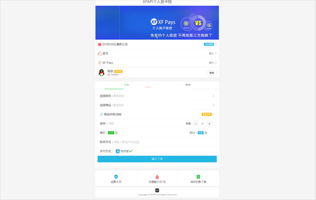 XFAPI个人发卡网平台是采用php+mysql进行开发的24小时自动售卡平台!