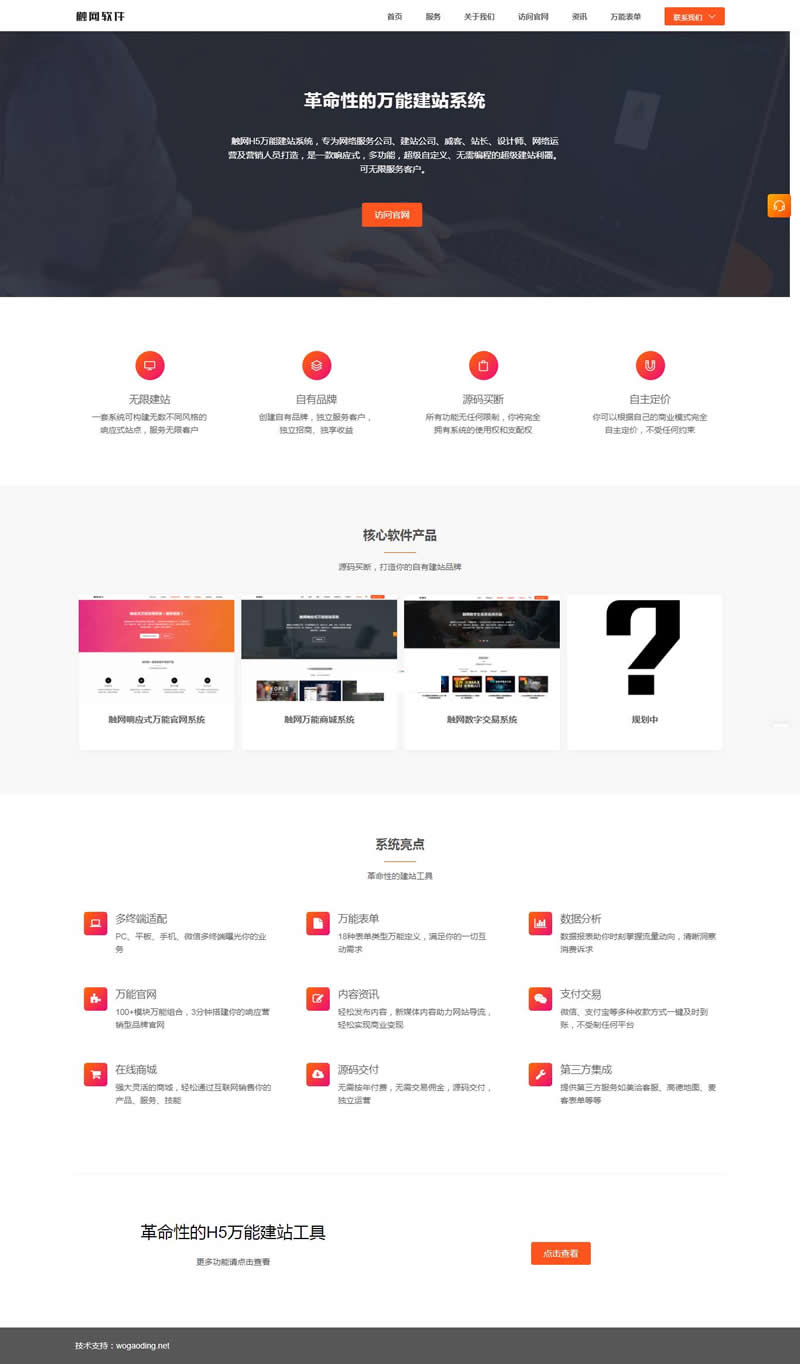 触网万能建站系统是一套真正意义上的万能建站工具,是一套专为定制而生的产品,也是一个赚钱利器,专为网络服务公司、建站公司、威客、站长、设计师、网络运营及营销人员打造,她将彻底帮你提高工作效率,降低投入成本,三网合一、拖拽布局、万能组合、超级自定义、无需掌握任何设计和编程技能,一套系统 无限可能