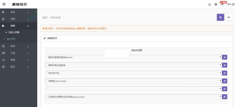 模块组件:任意模块可随意卸载、安装、编辑、复制、删除、开启或关闭,维护简单。