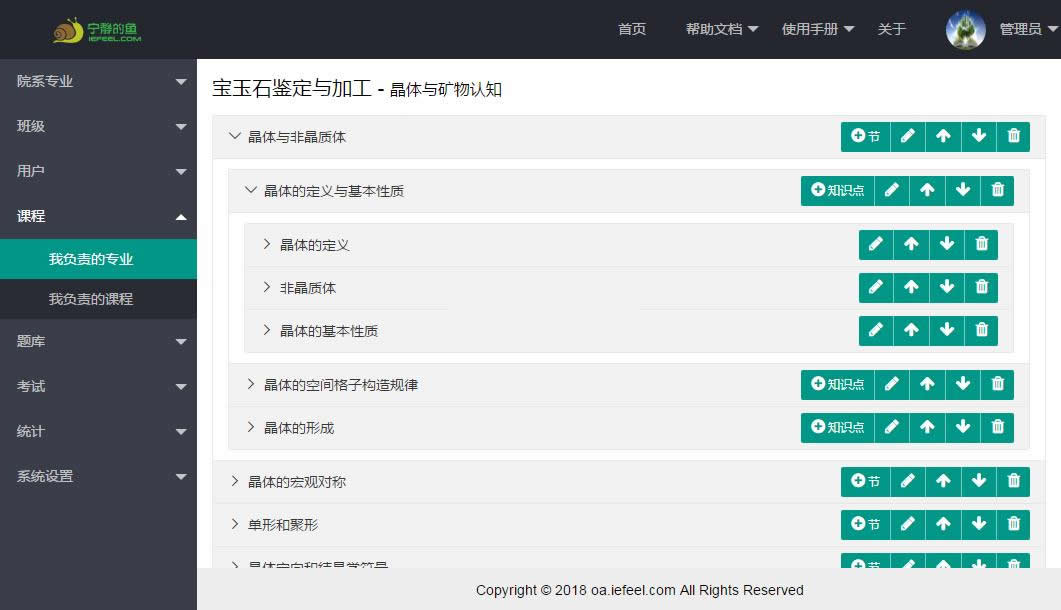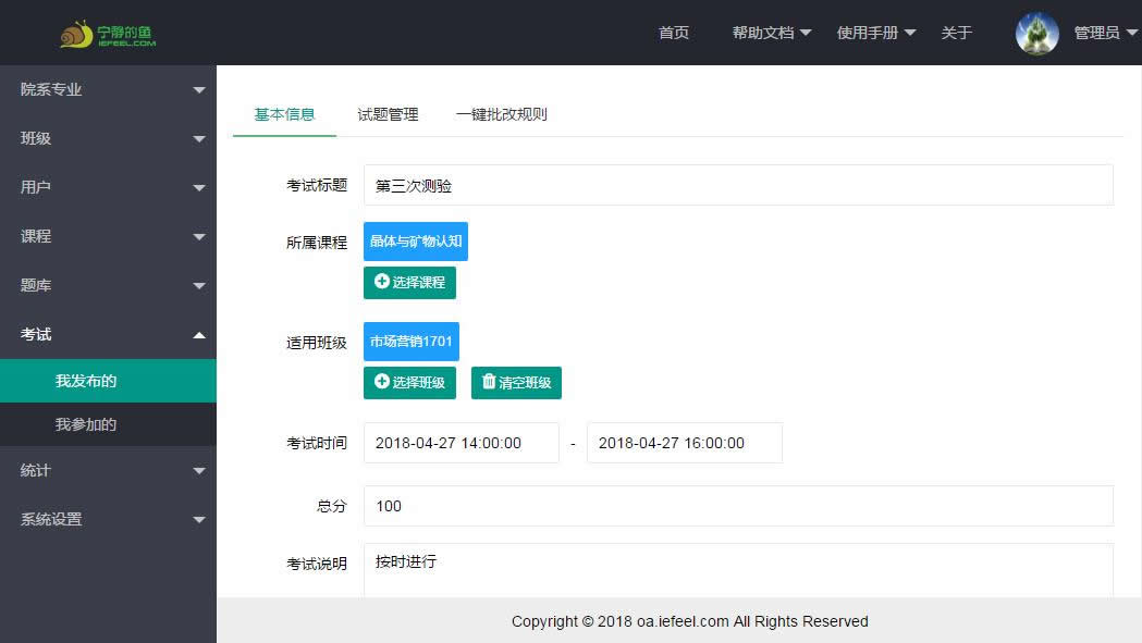 主要功能模块有院系专业管理、班级管理、用户管理、课程管理、题库管理、考试管理、数据统计等。