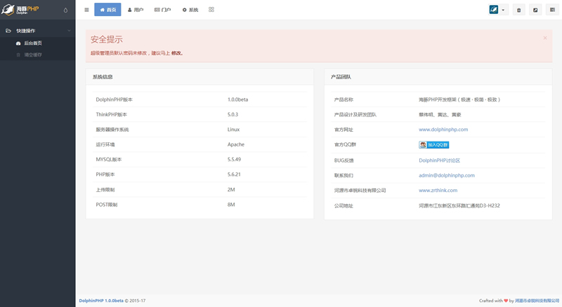 DophinPHP(海豚PHP)是一个基于ThinkPHP5.0.3开发的开源PHP快速开发框架,秉承极简、极速、极致的开发理念,为开发集成了基于数据-角色的权限管理机制,集成多种灵活快速构建工具,可方便快速扩展的模块、插件、钩子、数据包。统一了模块、插件、钩子、数据包之间的版本和依赖关系,进一步降低了代码和数据的沉余,以方便开发者快速构建自己的应用。