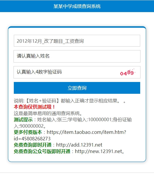 PHP+excel通用成绩查询系统是个极为简单却非常通用、非常方便的成绩查询系统,通用于几乎所有Excel单二维数据表查询。只需修改 查询条件和顶部、底部文字(非常简单),即可用于几乎所有工资等查询,成绩查询,物业查询,收电费查询,录取查询,证书查询等场景哦。