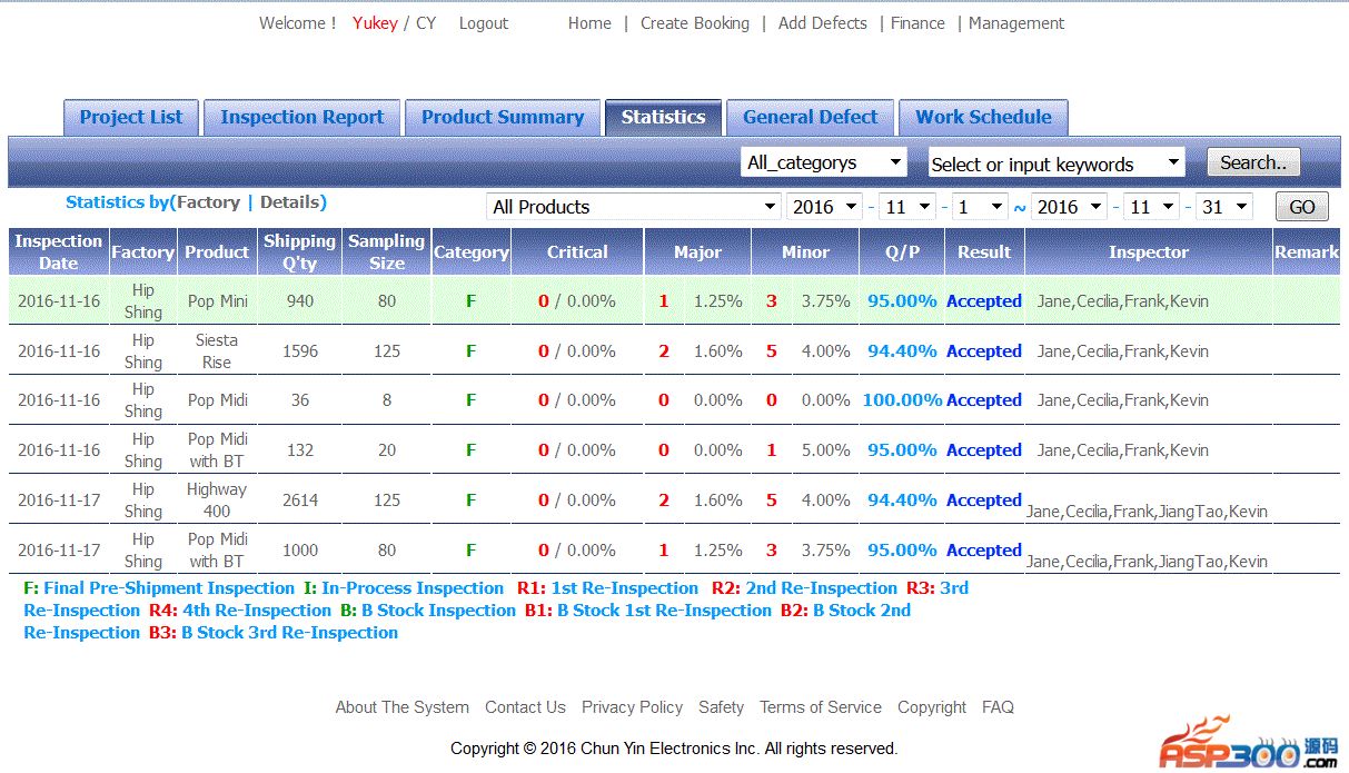 外贸验货报告系统界面非常简单明了,用于第三方验货公司对外贸产品的报告CMS及验货流程管理,工厂首先发Booking给第三方验货公司,验货公司将该Booking中的产品名称,产品型号及数量和日期等资料输入Create booking页面,然后生成一份空的验货报告,验完货后输入验货结果。有了前面的原始数据,点击统计页面将有一系列的统计效果出来。比如合格率百分比,不良统计及每家工厂的品质对比。内附安装说明。