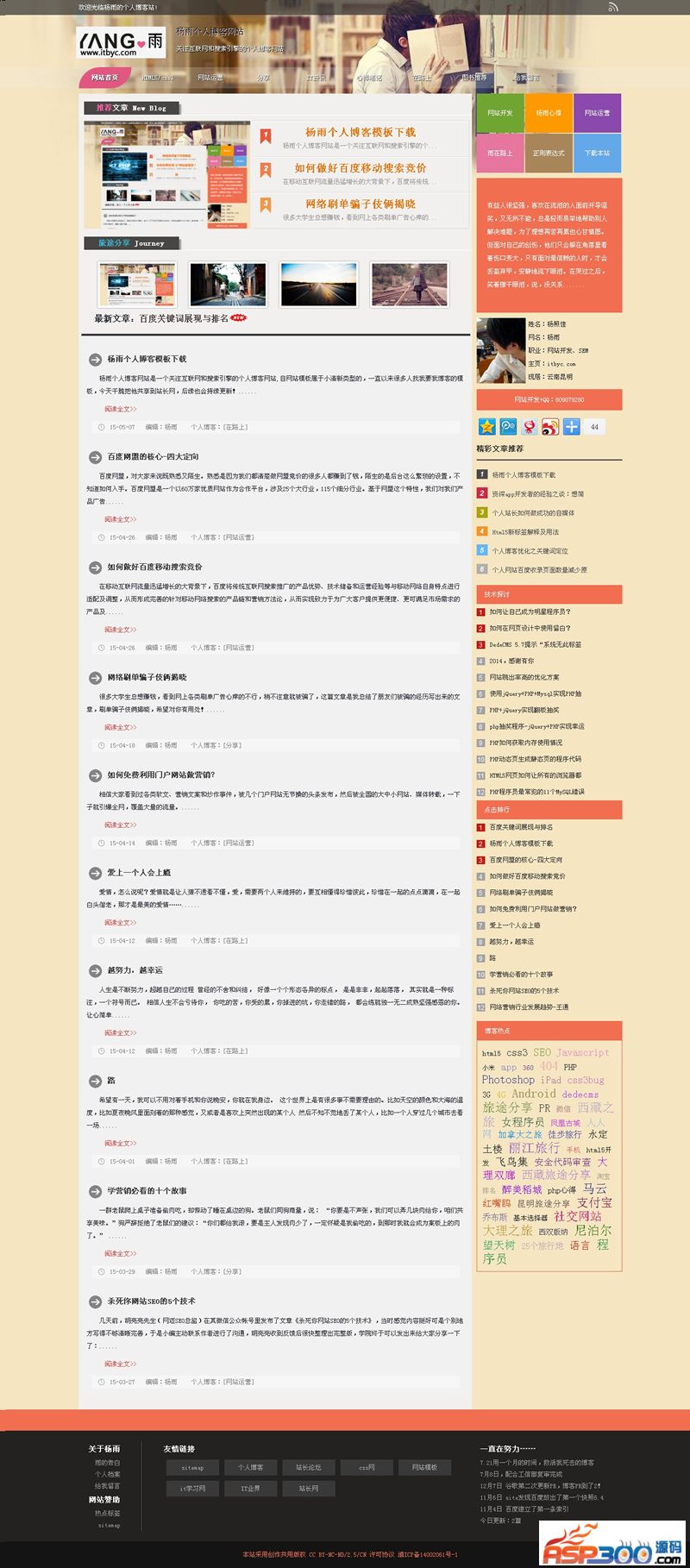 杨雨个人博客网站是一个关注互联网和搜索引擎的个人博客网站,网站模板属于小清新类型的,一直以来很多人找我要我博客的模板,今天干脆把他共享到站长网,后续也会持续更新!上传的版本是14年底的,后面我优化了自适应版本的导航不兼容等问题,等优化好了再更新。有问题可以加群获得帮助你需要更改的内容有:1.相关调用的栏目ID2.更改评论组件站点ID(多说)3.百度站内搜索代码4.广告代码5.更改htm里边的栏目ID为适合自己站点的(typeid="XX")6.更改多说评论模块站点ID7.更改网站个人信息8.替换include文件夹里边的common.func.php(标签云功能)9.替换include文件夹里边的arc.archives.class.php(列表错乱)