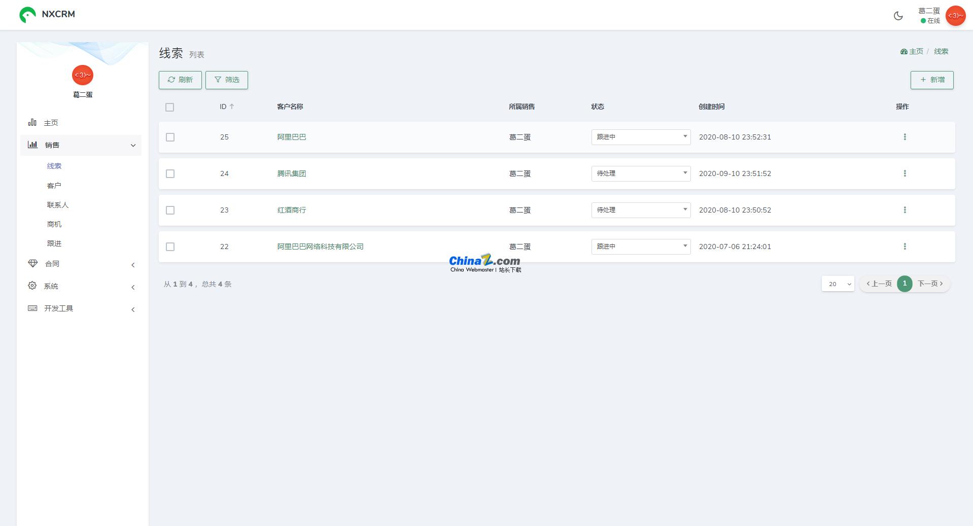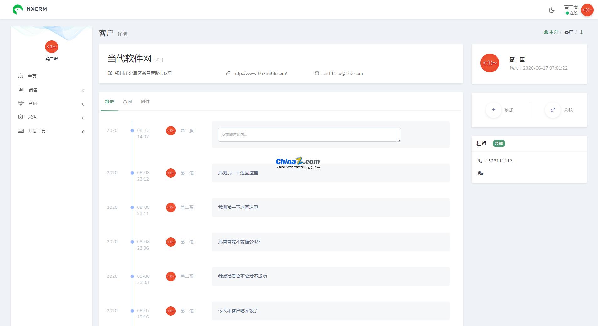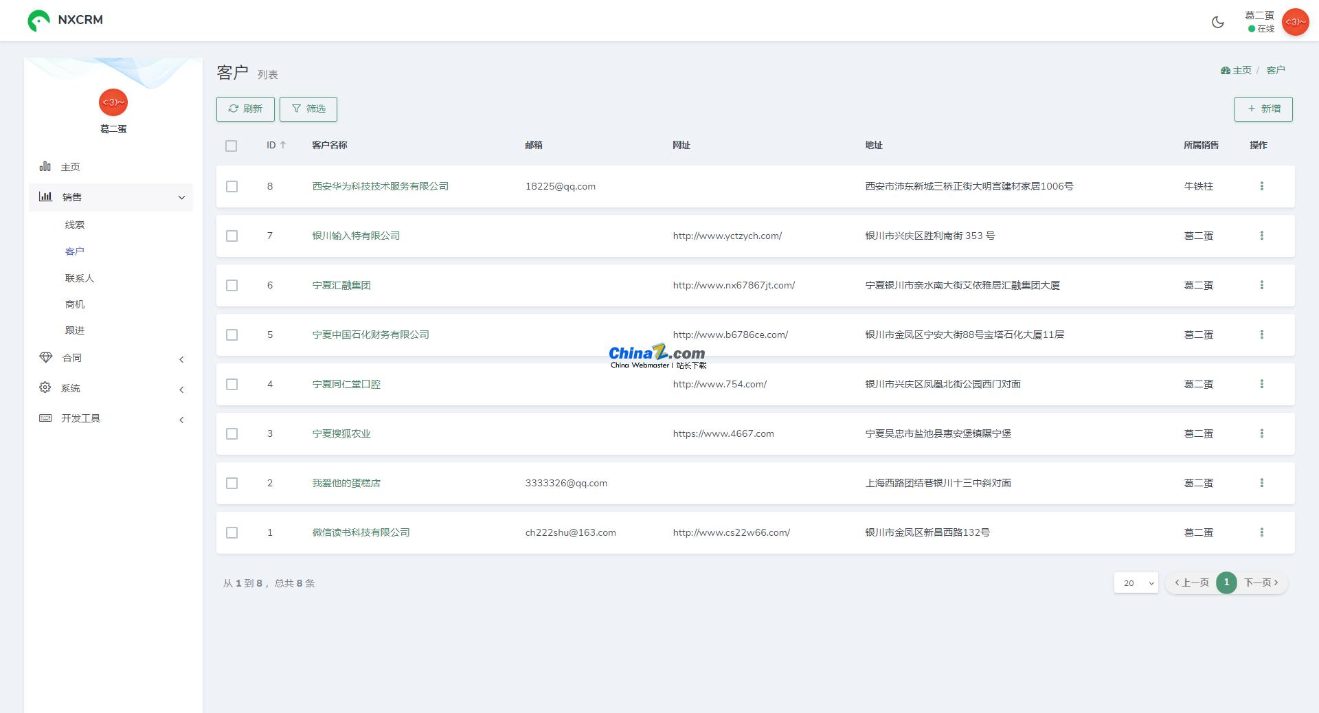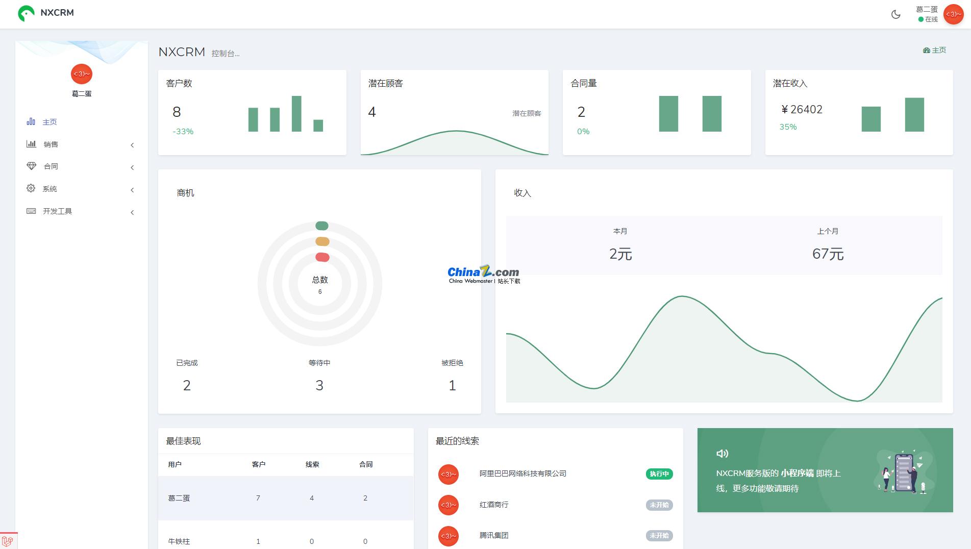 NXCRM 是宁夏南相开发的客户管理系统,包含了线索,商机,合同,收款,客户,附件,联系人,跟进动态等功能。囊括可客户管理所需的大多数功能。后期版本我们将增加小程序功能。敬请期待。