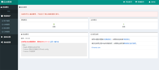 墨子课程管理系统系统是一款轻量级管理系统,基于PHP+Mysql架构的,可运行在Linux、Windows、MacOSX、Solaris等各种平台上,系统基于Laravel,支持自定义伪静态,前台模板采用DIV+CSS设计,后台界面设计简洁明了,功能简单易具有良好的用户体验,稳定性好、扩展性及安全性强。