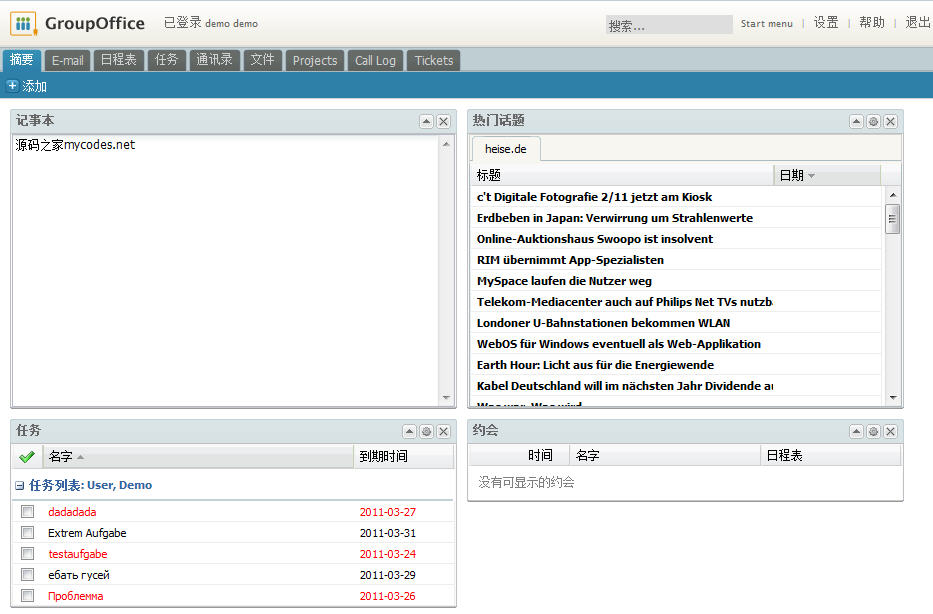 Group Office是一个基于Web的办公套件,其功能包括用户管理、模块管理、邮件客户端、文件管理器、日程、项目管理以及客户关系管理等,可方便与PDF和Outlook进行数据同步。