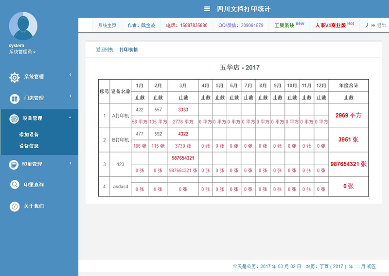 5、印量的查询,可以查询所有印量记录,也可以分门店,分年度,进行某设备的查询