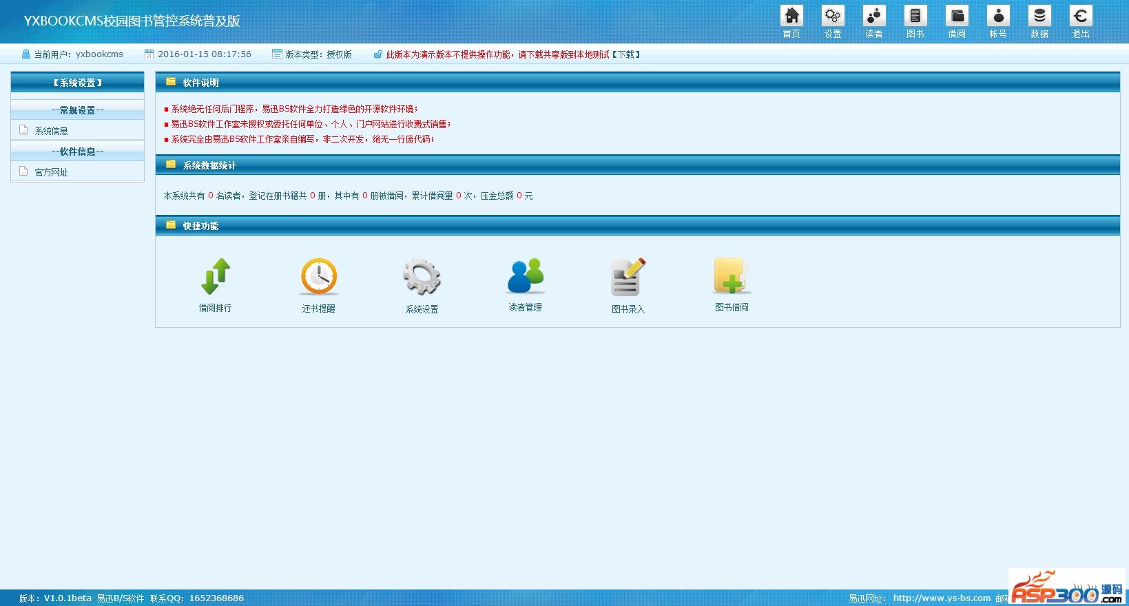 “YXBOOKCMS图书管控系统普及版”由易迅软件工作室开发,是一款超轻量级的院校图书管控系统,适用于中小学,高中,中职等各类院校图书馆的图书管控。