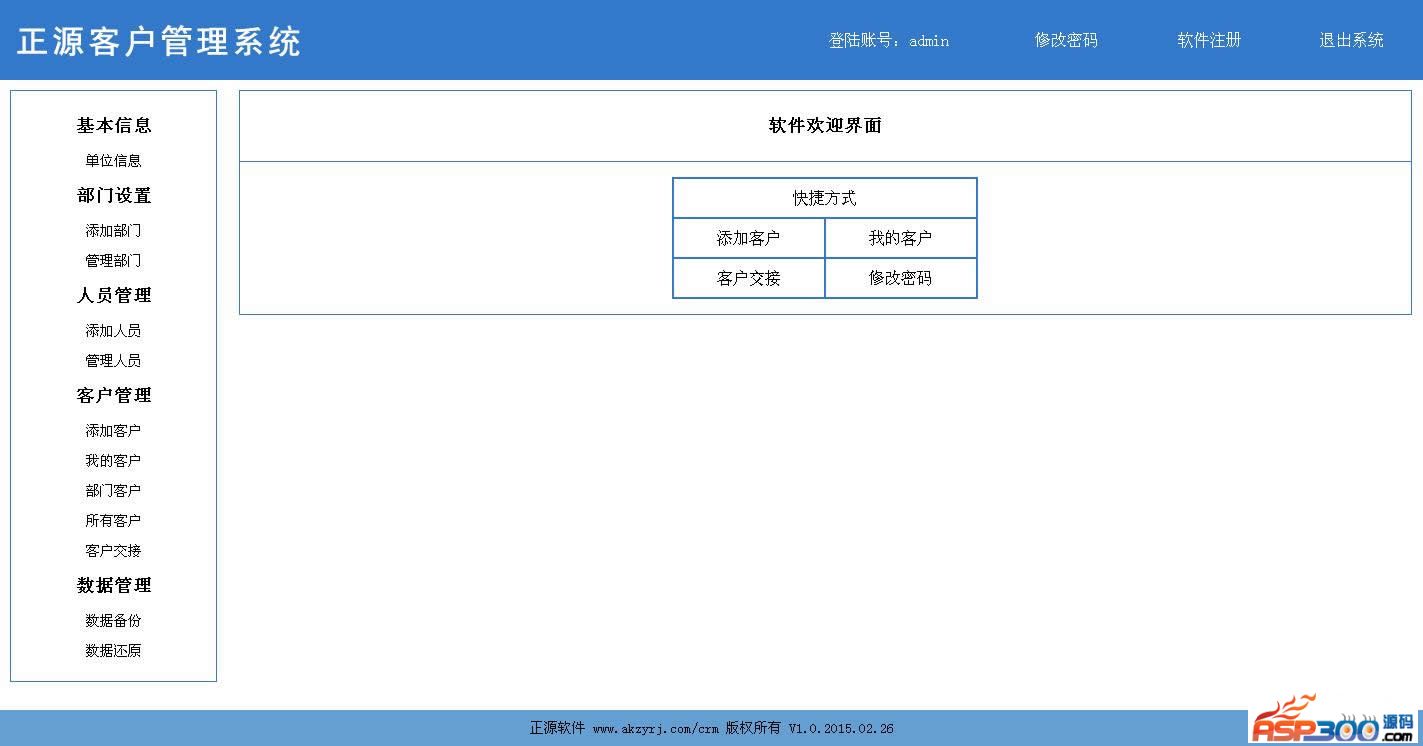 设置软件使用单位基本信息部门管理:设置软件使用单位相关部门人员管理:管理软件使用单位各部门相关人员客户管理:添加客户、客户管理、客户交接、客户跟踪系统管理:备份及还原数据库相关信息