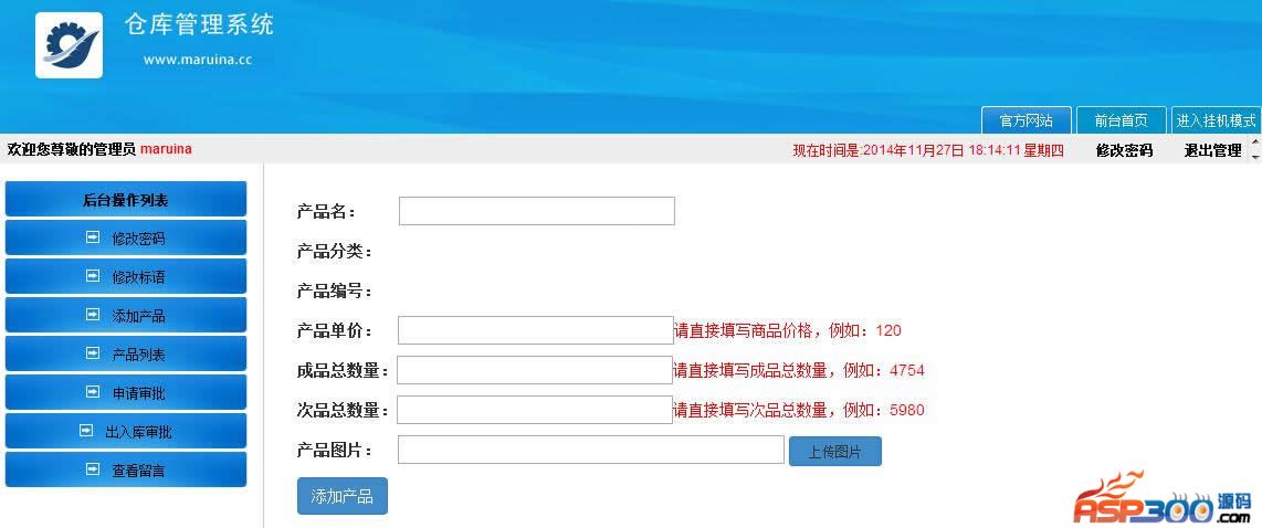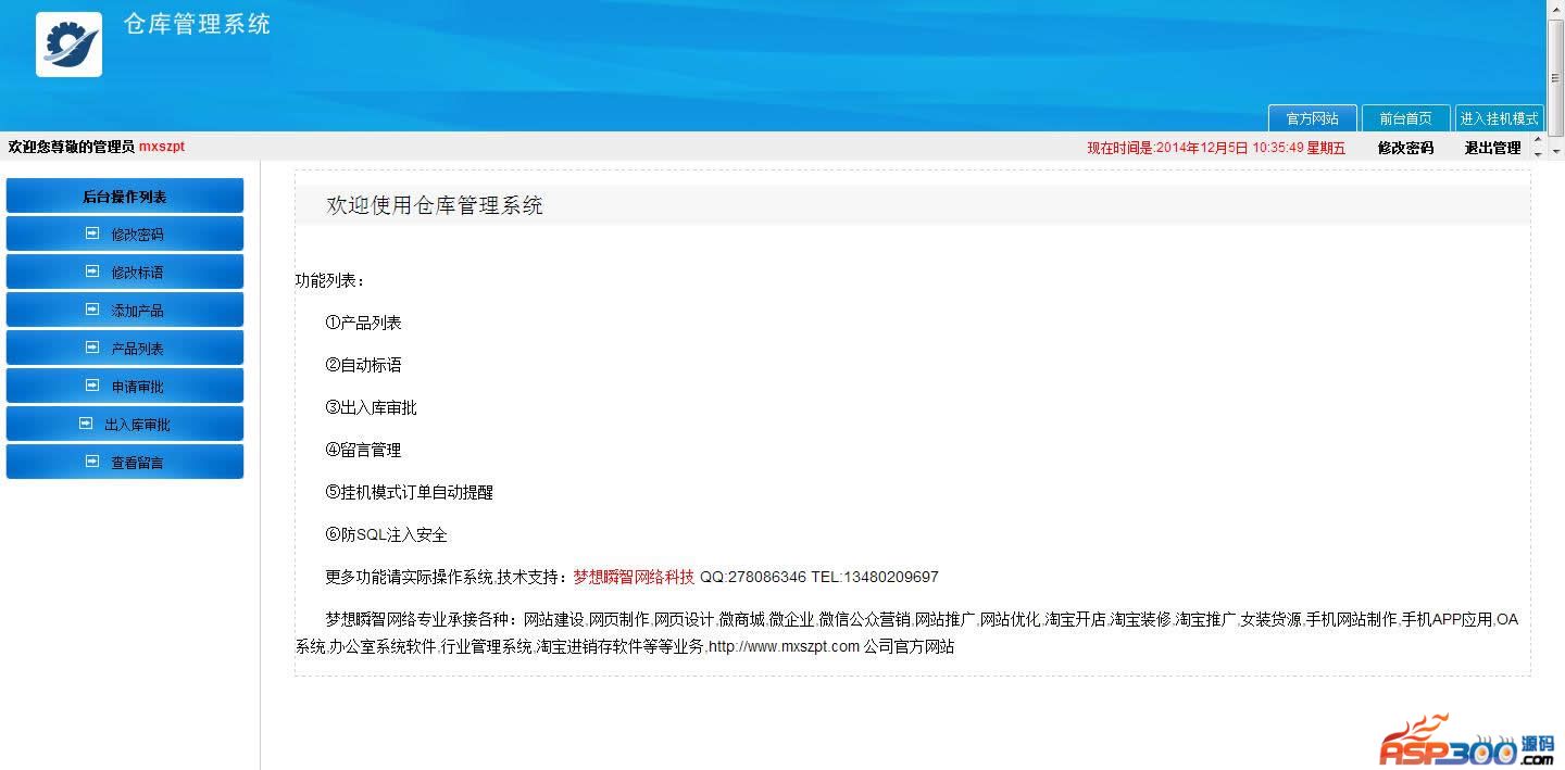 功能特点(具体功能请实际操作系统):①产品列表②自动标语③出入库审批④留言管理⑤挂机模式订单自动提醒⑥防SQL注入安全