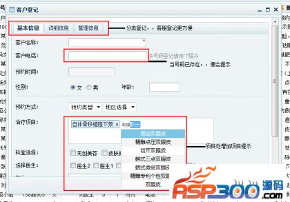 功能简介:一、客户登记模块1,客户登记改动进行分类登记,,这样客服在快捷登记时会很方便,,“项目登记”的提示不用的可以在后台关闭;2,搜索栏对搜索功能进行了加强,,’高级搜索‘基本可以组合所有条件搜索3,(按部分用户要求)对客户处理,原来的“修改”和“删除”只能对3天前的客户进行操作,,改为单日操作次数限制,,当每天修改次数超过6次后,咨询人员便无法在使用修改功能,,此次数可以在后台设置。4,增加了“客户操作日志查看”–“客户数据导出(原来只能在后台导)”–修改了对客户“再预约”–“再回访”–提醒处理模式;增加对客户“放弃”-“领养”功能,对过久不维护的客户,及不想维护的客户,,可以放弃,,让想维护的客服人员进行维护;二、来访挂号模块1,增加了打印功能,后台配置相应打印模板设置;每个客户客户都有自己的二维码,后期会加上对条形码的支持后台设置简单三、办公管理模块,1,将原来oa系统的,工作汇报模块做到客户系统里